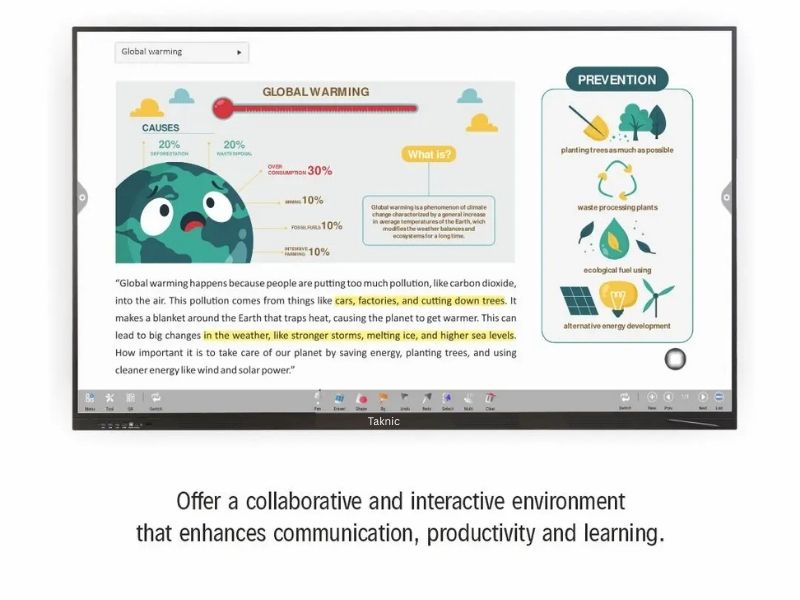 • The device features advanced touch technology for natural writing, supports multi-point touch on Android and Windows, operates on Android 14 with 8 GB RAM and 128 GB ROM, and includes an aluminum frame, stereophonic speaker, multiple signal inputs, and 4mm anti-scratch glass. It supports dual operating systems with Android OS and optional Windows 10 via a pluggable module, includes classroom apps, password protection, high brightness, multi-language OSD support, optional OTA updates, and a Display Management System. It supports multi-touch, high-resolution 4K/Full HD display with anti-glare glass, smart writing tools, wireless connectivity, built-in OS compatibility, interactive whiteboard software, and collaboration tools for remote participation and video conferencing.