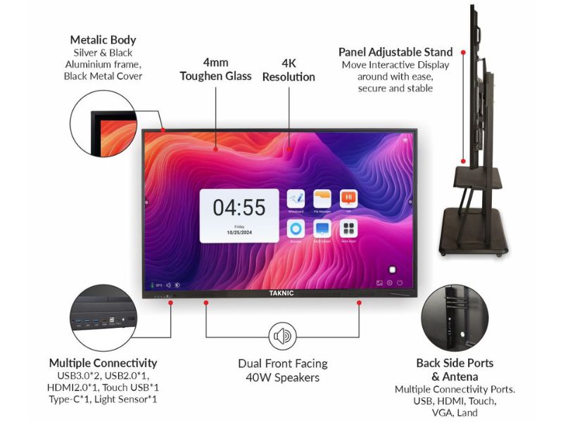 • The device features advanced touch technology for natural writing, supports multi-point touch on Android and Windows, operates on Android 14 with 8 GB RAM and 128 GB ROM, and includes an aluminum frame, stereophonic speaker, multiple signal inputs, and 4mm anti-scratch glass. It supports dual operating systems with Android OS and optional Windows 10 via a pluggable module, includes classroom apps, password protection, high brightness, multi-language OSD support, optional OTA updates, and a Display Management System. It supports multi-touch, high-resolution 4K/Full HD display with anti-glare glass, smart writing tools, wireless connectivity, built-in OS compatibility, interactive whiteboard software, and collaboration tools for remote participation and video conferencing.