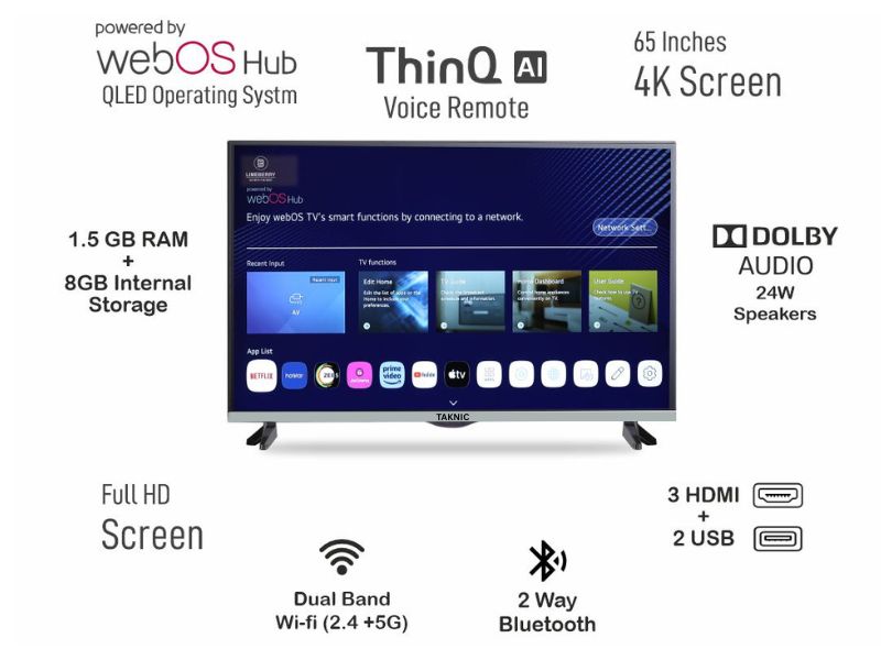 Our 50inch OLED WebOS TV features 4K UHD resolution, complemented by a 4K AI processor that ensures 100% color fidelity and 100% color volume. With ThinkQ AI it offers enhanced capabilities such as smart voice control air control and intelligent voice recognition. Additionally it includes built in features like Apple AirPlay 2 Apple HomeKit and Hey Google integration. The Taknic TV is further enhanced with Dolby Vision providing ultra vivid picture quality and immersive spatial audio through Dolby Atmos. Its artistic design makes the Taknic TV visually appealing from every angle thanks to its slim design. Moreover it is distinguished by its Epic Gaming Adventure featuring a blazing fast 0.1ms response time and a gamer oriented user experience that delivers a smooth and clear gaming experience